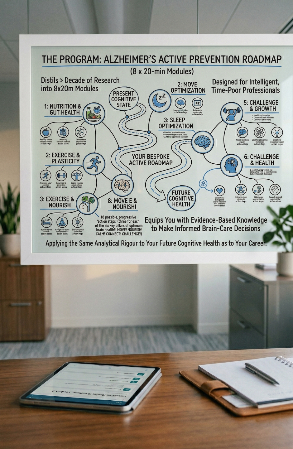 The Alzheimer’s active prevention roadmap distils over a decade of rigorous research into 9 x 20-minute modules. Designed for intelligent, time-poor professionals, it equips you with the evidence-based knowledge to make your own informed brain-care decisions — applying the same analytical rigour to your future cognitive health that you’ve applied throughout your career.